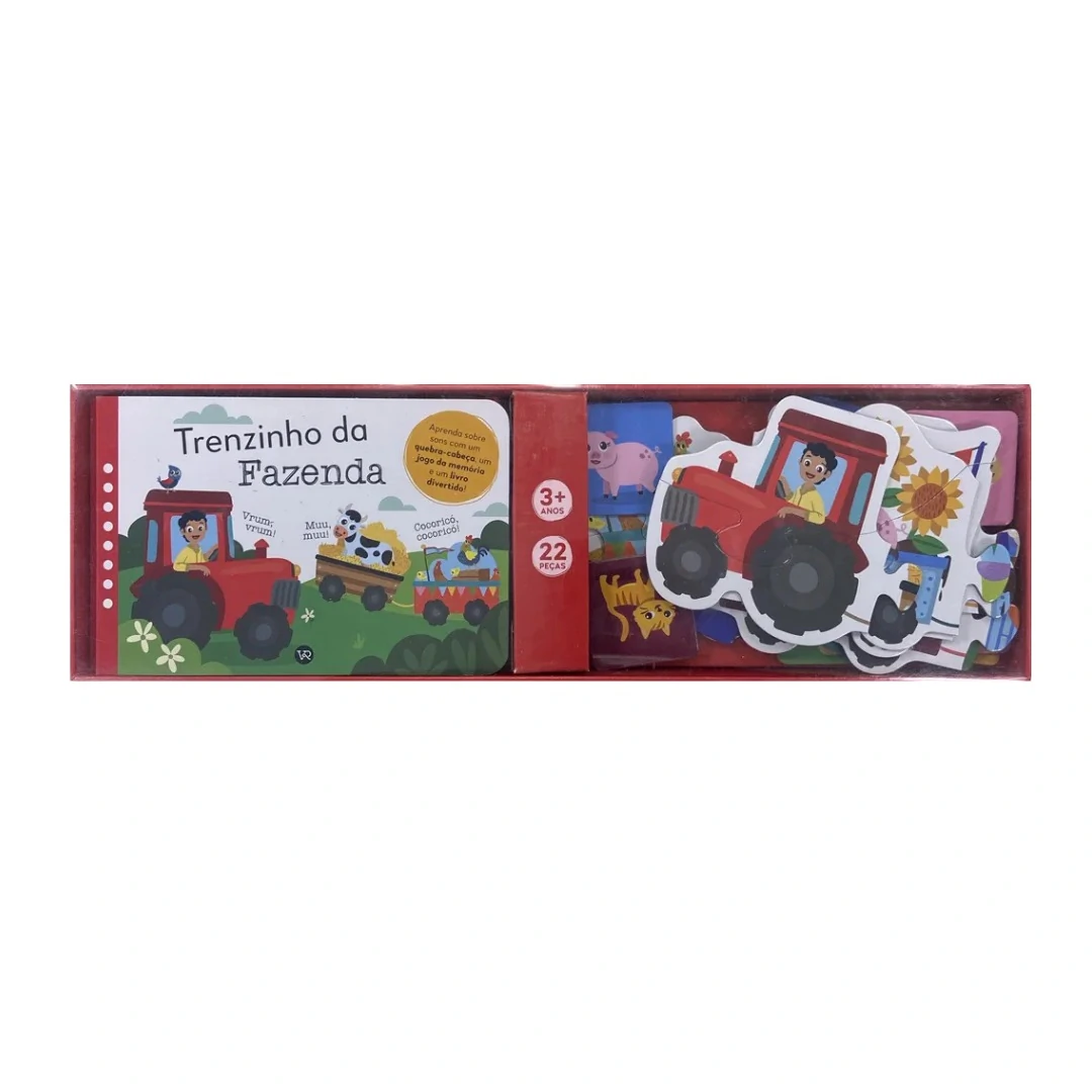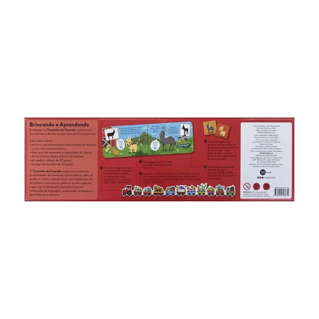 O Trenzinho da Fazenda proporciona inúmeras possibilidades de conversas e brincadeiras, além de ajudar a criança a desenvolver suas habilidades de reconhecer e pronunciar palavras e sons especiais, o que é de fundamental importância para a construção da linguagem, preparando os pequenos para falar, ler e escrever. • Um livro com informações sobre animais da fazenda e seus sons característicos • Fotos que vão aumentar a capacidade da criança de reconhecer alguns animais da fazenda • Um quebra-cabeça de 22 peças • Um jogo da memória de 22 peças.