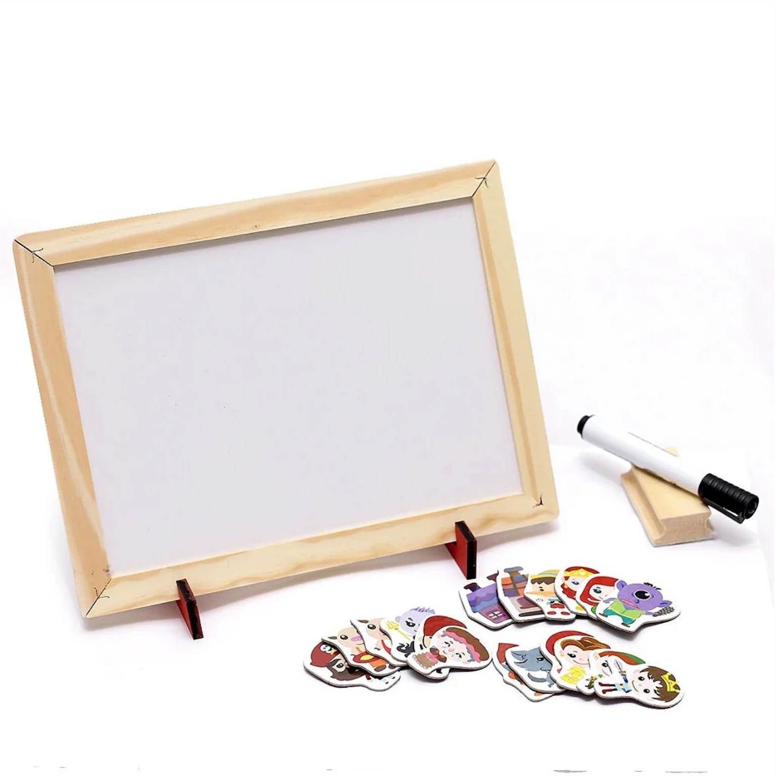 Conteúdo: 23 peças magnéticas, 1 painel magnético dupla face, 1 caneta com apagador e 2 suportes.