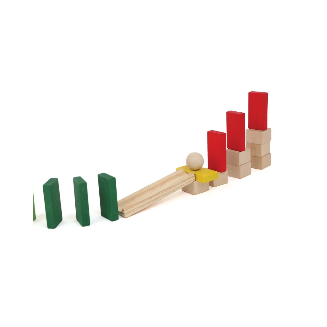 Contém 38 peças de madeira que formam divertidos e diferentes circuitos com canaleta, bolinha, ponte, torres e o que a imaginação for capaz de inventar.