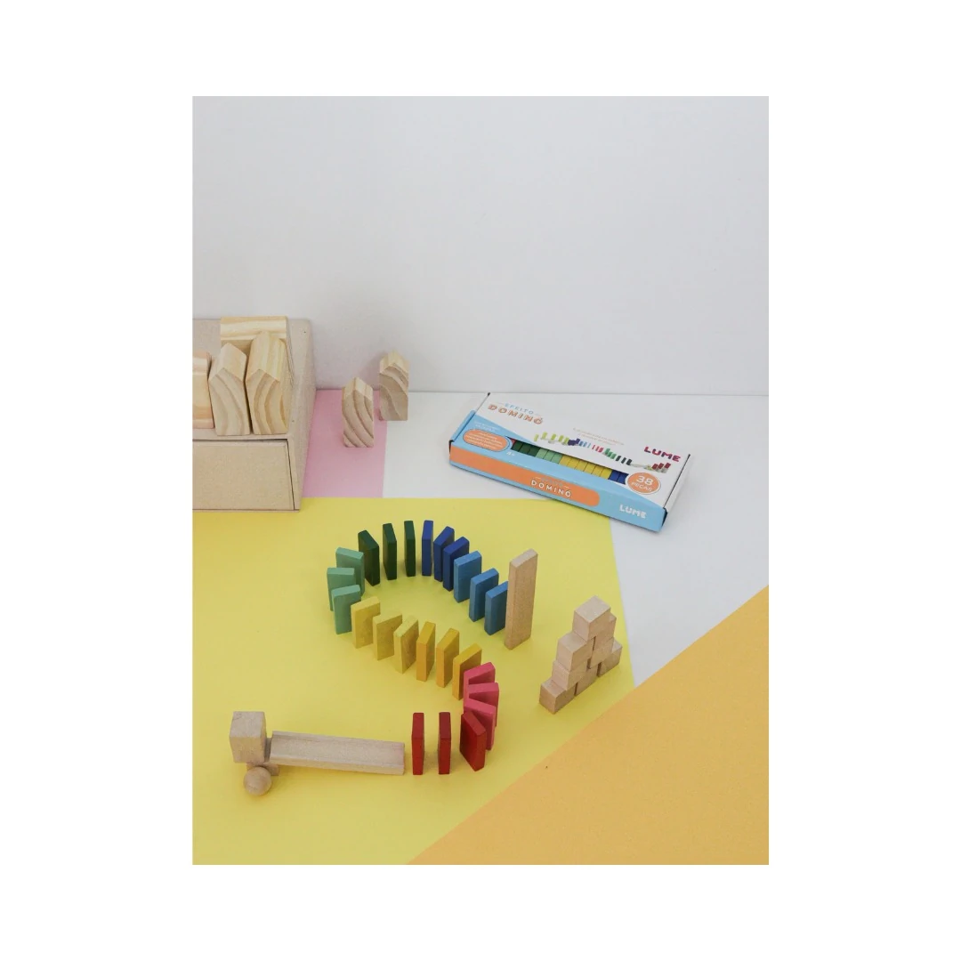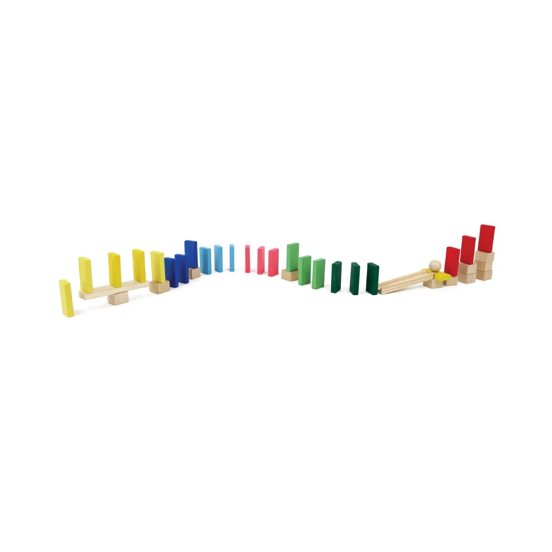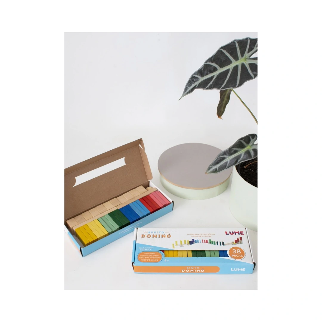 O objetivo desta brincadeira é enfileirar as peças de modo que, ao derrubar a primeira, todas caiam em um efeito dominó.