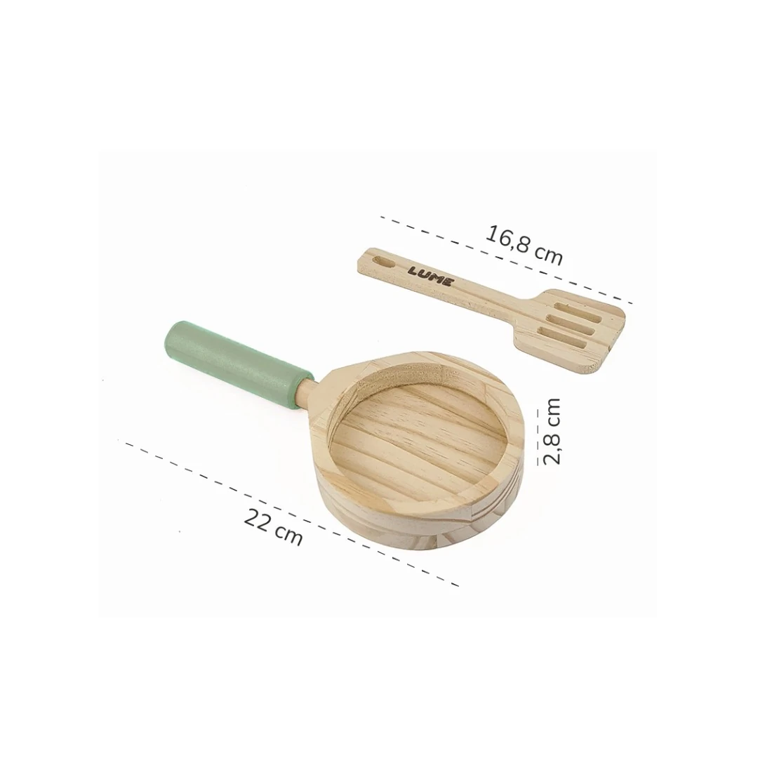 Composto por frigideira e espátula, inspira a narrativa imaginativa, o jogo imitativo e a criatividade na medida em que a criança brinca de praticar habilidades culinárias básicas. Possuem design contemporâneo, a qualidade que a madeira maciça oferece e uma variedade de cores, o suficiente para fazer você se apaixonar e brincar de comidinha com toda a família.