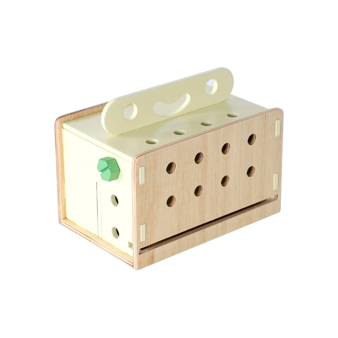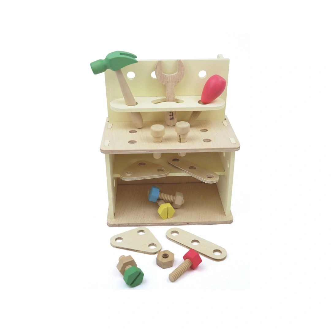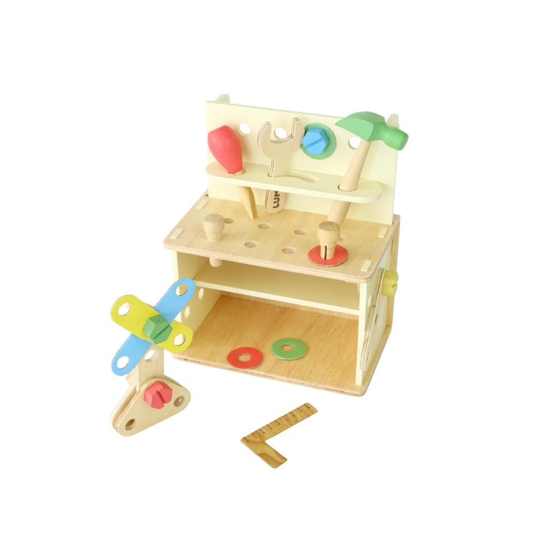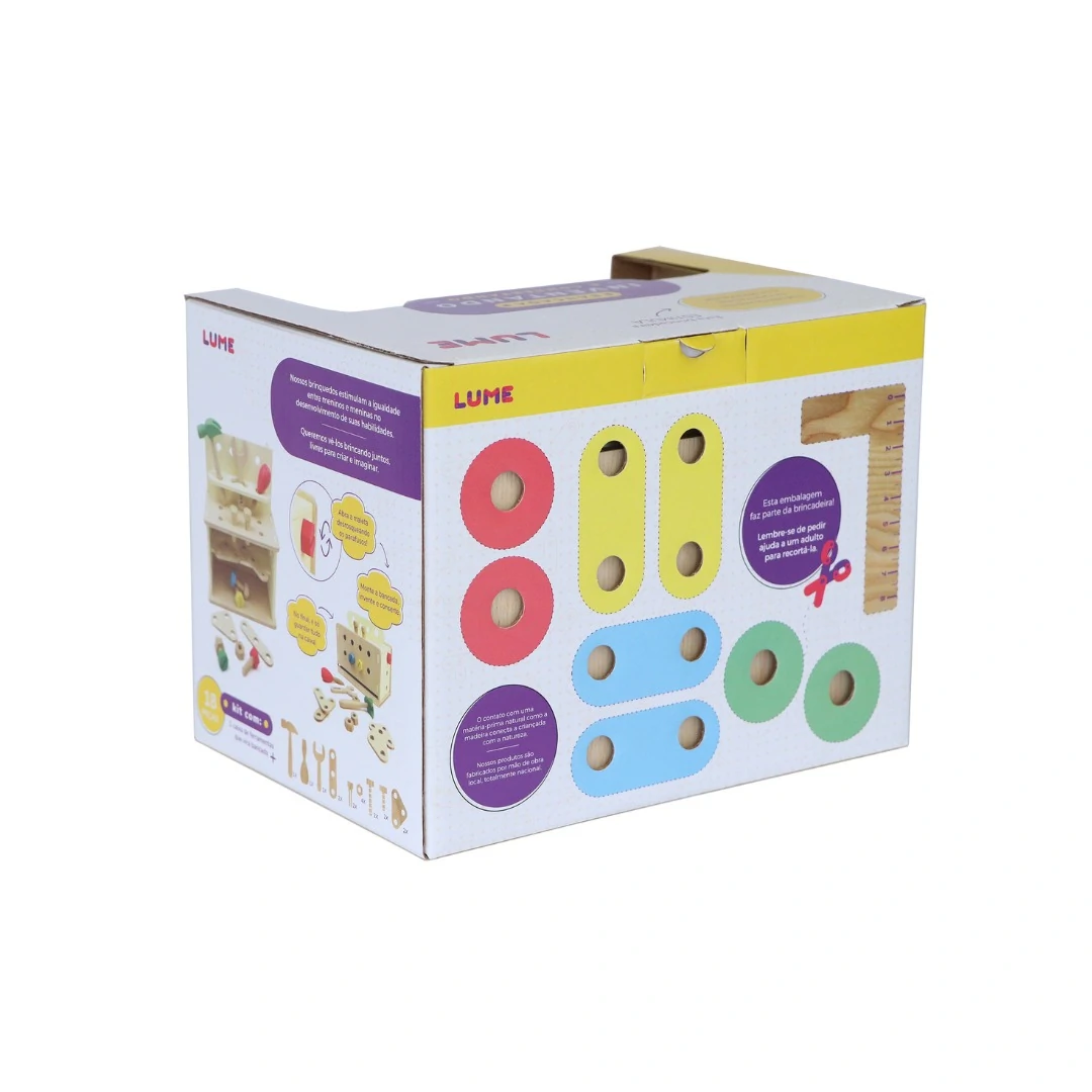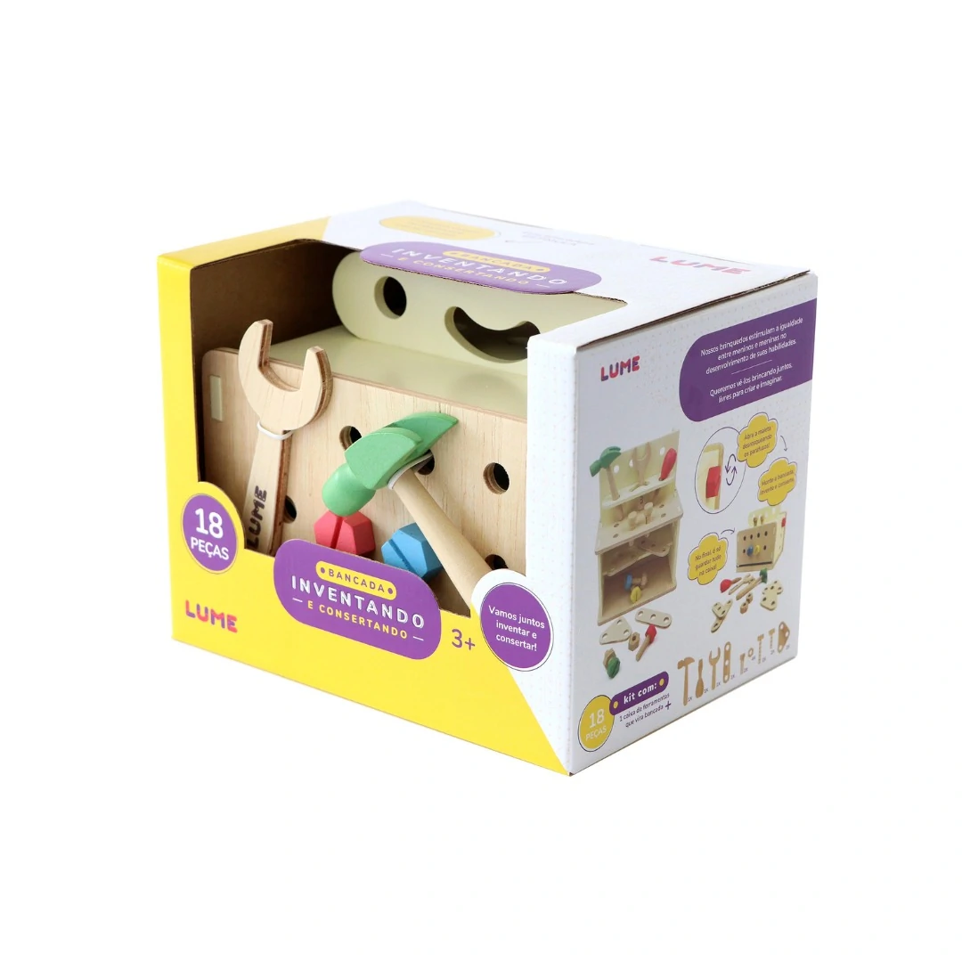 Ao abrir a maleta, ela vira uma bancada, onde a criança pode organizar as peças, martelar pregos e rosquear parafusos. Estas atividades auxiliam no desenvolvimento da criatividade e motricidade.