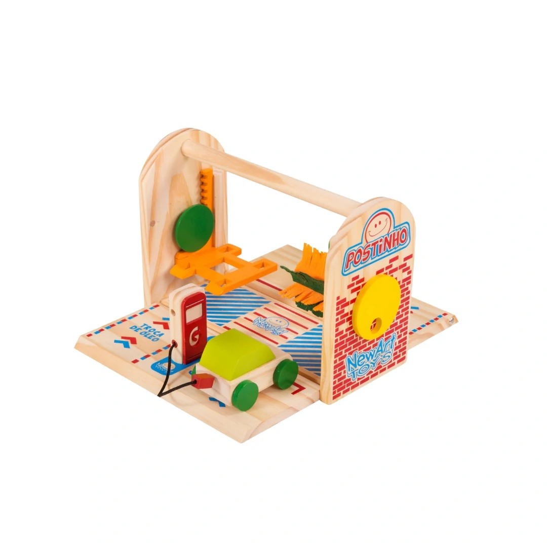 Feito em madeira e cheio de detalhes encantadores como uma plataforma que sobe e desce, um carrinho, bomba de abastecimento, ele pode ser fechado como uma maleta facilitando seu transporte e levando a diversão para todo lugar. Feito para criar e recriar histórias estimulando a criatividade, o postinho maleta rende horas incontáveis de diversão.